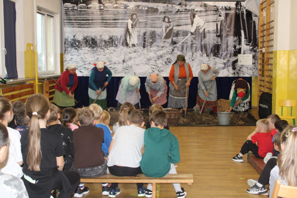 W naszej szkole odbyło się niezwykłe wydarzenie, które połączyło pokolenia, tradycję i żywą kulturę regionu. Uczniowie mieli okazję uczestniczyć w wyjątkowym widowisku przygotowanym przez zespół śpiewaczy „Sąsiadeczki”, dla których pielęgnowanie dziedzictwa ludowego jest prawdziwą pasją.