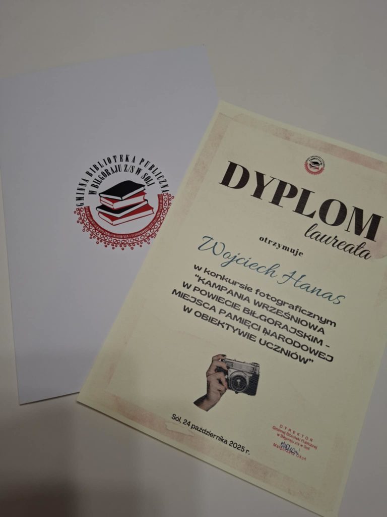 Z ogromną radością i dumą informujemy, że nasz uczeń został laureatem historycznego konkursu fotograficznego! Jego praca, ukazująca pamięć o wydarzeniach i bohaterach przeszłości, zachwyciła jury nie tylko walorami artystycznymi, ale także głębokim przekazem historycznym. Serdecznie gratulujemy Wojtkowi. To wspaniały przykład, że pasja połączona z zaangażowaniem może prowadzić do pięknych sukcesów. Niech ten wynik będzie także motywacją dla innych uczniów do rozwijania swoich talentów — zarówno w dziedzinie historii, jak i wrażliwości artystycznej.